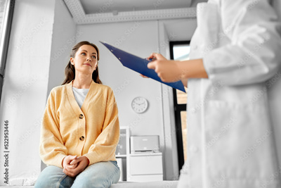 medicine, healthcare and people concept - female doctor with clipboard talking to woman patient at hospital