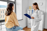 medicine, healthcare and people concept - female doctor with clipboard talking to woman patient at hospital