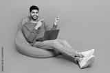 Full body photo of young latin arab man sit beanbag laptop point empty space wear stylish green look isolated on purple color background