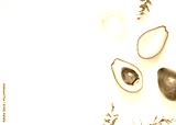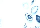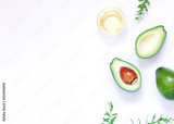 Halves of fresh avocado fruits close up on the white table. Top view. Copy space