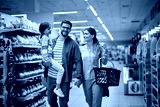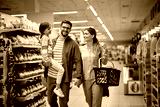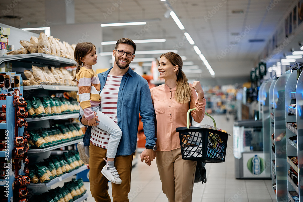 Happy parents and their small daughter enjoy in shopping day at supermarket.