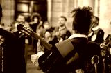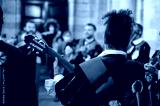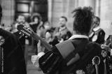Tuna Music of Santiago - Band of University students musicians, dressed in academic costume, playing and singing serenades. on a Santiago de Compostela city street, Galicia, Spain