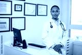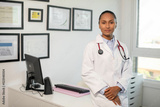 Portrait of confident female general practitioner in office. Young African American female doctor wearing lab coat and stethoscope standing at table with computer. Woman doctor concept