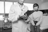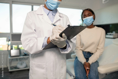 Close-up of female doctor wearing gloves writing diagnosis on clipboard with female patient sitting in background. Young African American woman visiting clinic. Medical exam concept