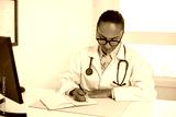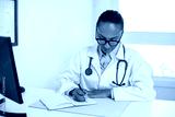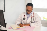Portrait of smiling female doctor writing in notebook in office. African American general practitioner wearing eyeglasses working in office. Medical service concept