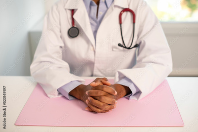 Close-up of clutched hands of female doctor sitting at table. Young African American doctor wearing lab coat and stethoscope sitting in her office. Medical service concept