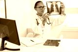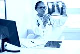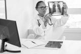 Portrait of serious female doctor looking at x-ray image. Young African American medic sitting at table examining radiological picture of lungs. Radiology research, pneumonia or asthma concept