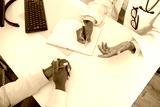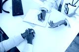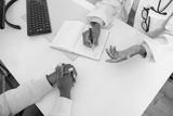Hands of female doctor writing down symptoms of patient at table. Close-up of African American general practitioner consulting woman. Visit to doctor concept