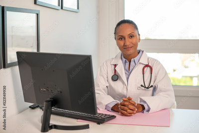 Portrait of smiling female general practitioner at her workplace. Young African American doctor wearing lab coat and stethoscope sitting at computer. Woman doctor concept