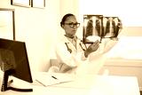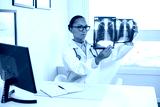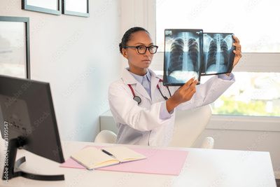Serious pulmonologist examining x-ray pictures of human lungs. Worried young African American doctor sitting at table and looking at radiological image. Radiology research, pneumonia or asthma concept