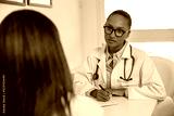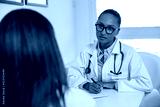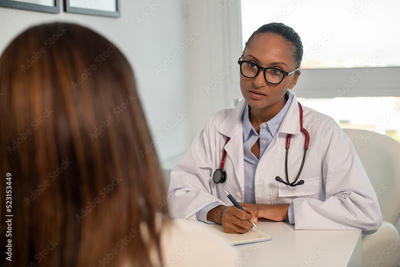 Doctor wearing glasses listening to female patient. Young African American general practitioner talking to woman and writing down diagnosis in notebook. Visit to doctor concept