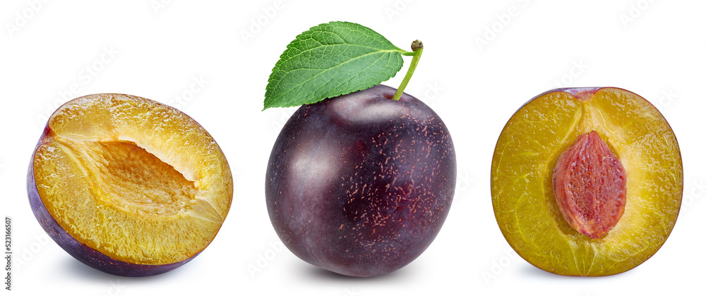 Plum collection with leaves isolated on white background. Plum set Clipping Path. Plum macro studio photo