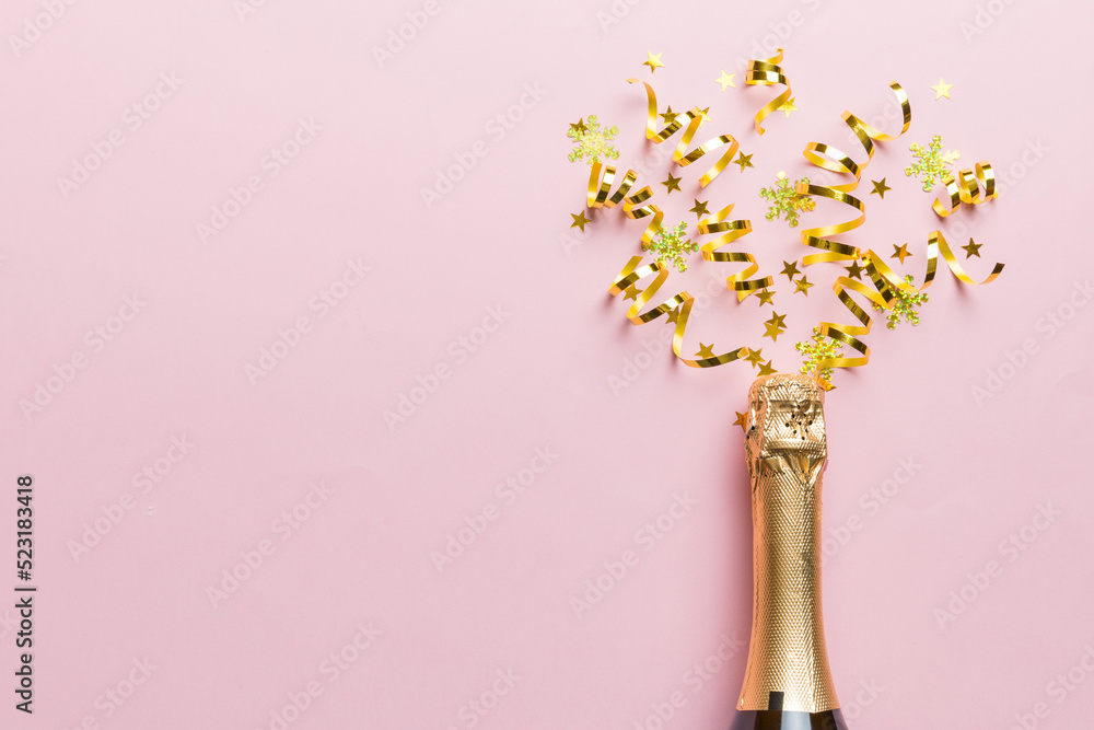 Creative flat lay composition with bottle of champagne and space for text on color background. Champagne bottle with colorful party streamers. holiday or christmas concept