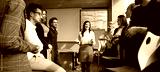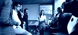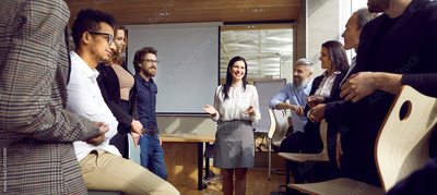 Happy diverse business team having a work meeting in a modern office. Multiracial group of young and mature people discussing their company strategy and making plans together. Banner background