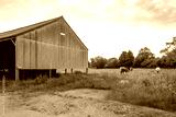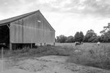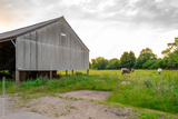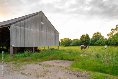 Large, asbestos built shed seen in a rural setting. Horses are seen grazing on the lush grass.