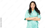 Young Asian woman wearing patient outfits Happy Patient pretty girl get confident with arms crossed and smile face isolated on white background and copy space Health care and medical Insurance concept
