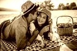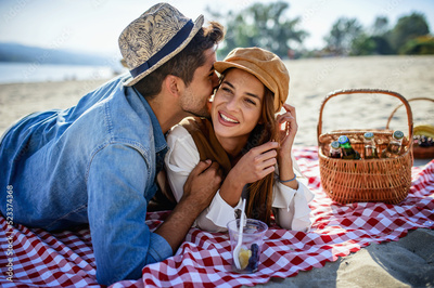Picnic. Young couple having fun on the beach. Lifestyle, love, dating, vacation concept