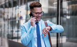 Money transfer is on time. Businessman looking at his watch while waiting a confirmation about money transfer from his client. Business, lifestyle concept