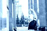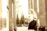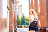a beautiful schoolgirl or student goes to class. a girl with beautiful curly lond hair looked back in front of the entrance to the university