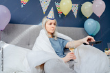 Sad woman in pajamas, party cap drinks champagne and watches TV, wrapped in a blanket while sitting on a bed in a decorated bedroom. Celebrates a birthday alone. Boring home party. Selective focus