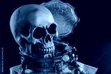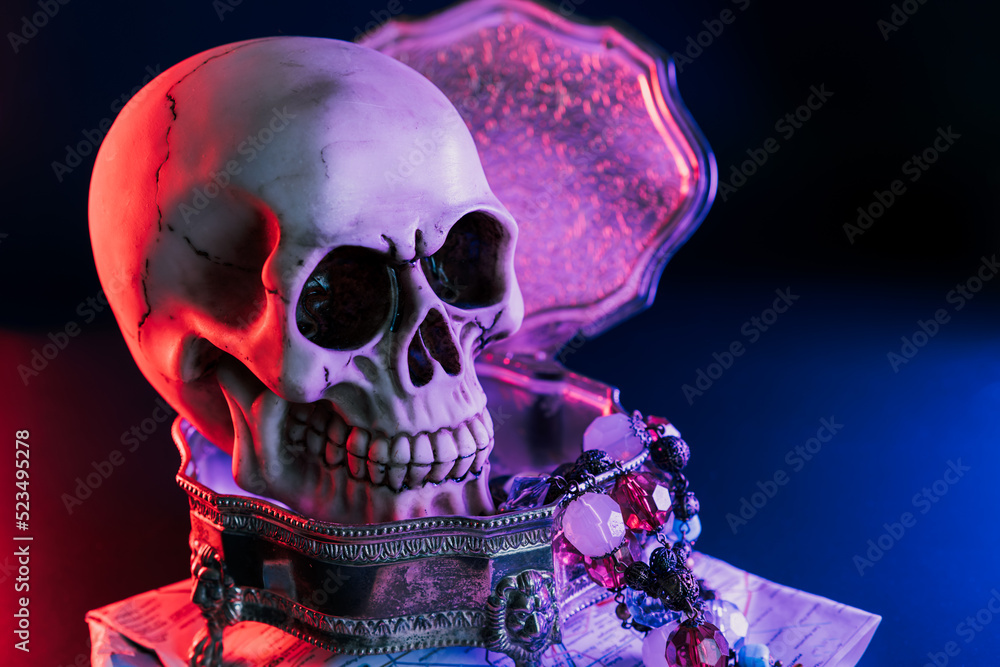 Human skull and treasure in copper vintage box on the map in neon red and blue light on dark background. Pirate treasure, treasure seekers concept . Selective focus, copy space