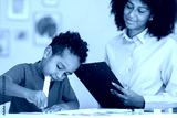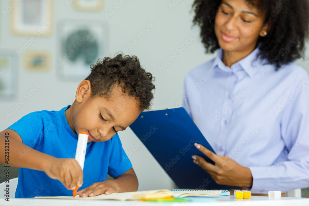 Little boy, training in kindergarten, sitting at the table with a friendly teacher and doing various tests, a young female psychologist working with a preschooler
