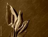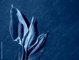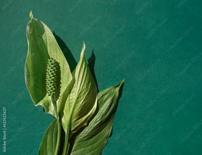Peace lilies plant flowers composition on the green background. Top view. Copy space