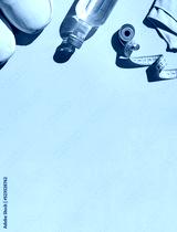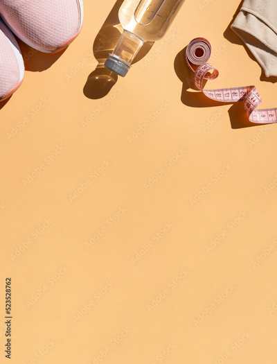 Sport wear or losing weight concept frame with bottle of water and measuring tape on the sunny orange background. Work out top view. Copy space