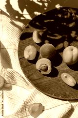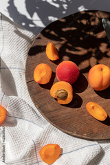 Organic ripe apricots under sun shadows on the brown wooden board close up