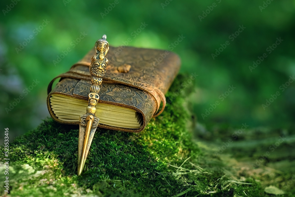 Ritual knife and magic spell book on mossy stump, blurred natural green background. Phurba is a three-sided knife, traditionally of Indo-Tibetan Buddhism. used for esoteric spiritual magic practice