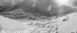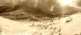Panoramic landscape of a snowy forest in the mountains on a sunny winter day whis. Ukrainian Carpathians, near Mount Petros, there is group of tourists.