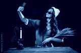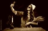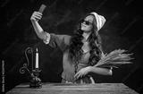 Vintage style. Young charming redhair girl with long curly hair like girl of renaissance eras isolated on dark background. Eras comparison, beauty, art, painting