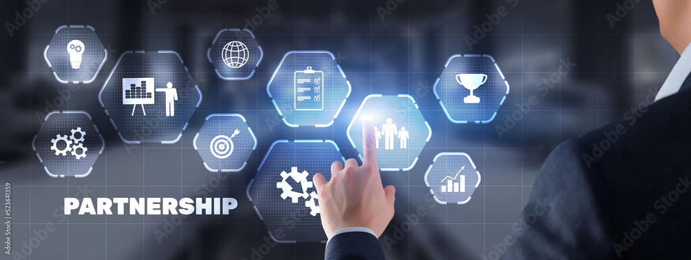 Business partnership and success concept. Businessman presses finger partnership