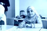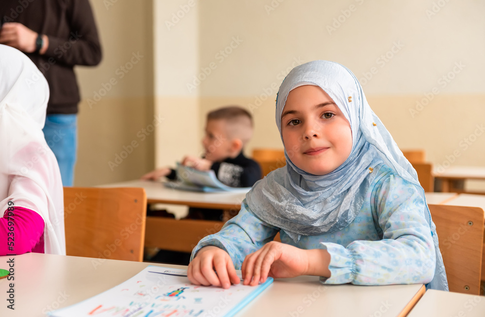 Group of happy Muslim school children sitting at the desk in the classroom.
