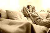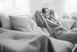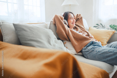 Happy asian woman listening to music from mobile phone while sitting on the the sofa at homes, Smiling girl relaxing with headphones in morning, Time to relax. copy space.