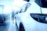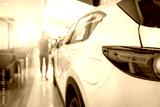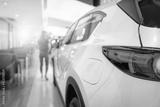 Closeup tail light of white SUV car parked in luxury showroom. Car dealership office. Rear view new car in modern showroom. Car for sale. Automobile leasing and insurance. Dealer agent business.