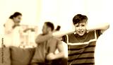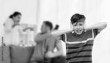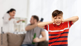 emotional abuse, family issue and violence concept - boy closing his ears with hands over parents fighting on background