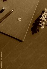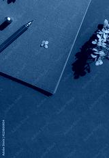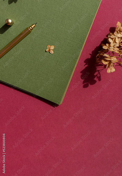 Green paper spiral notebook with dried hydrangea flowers on the purple background. Copy space