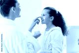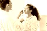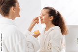 beauty, hygiene, morning and people concept - happy smiling mother and daughter with moisturizer at bathroom