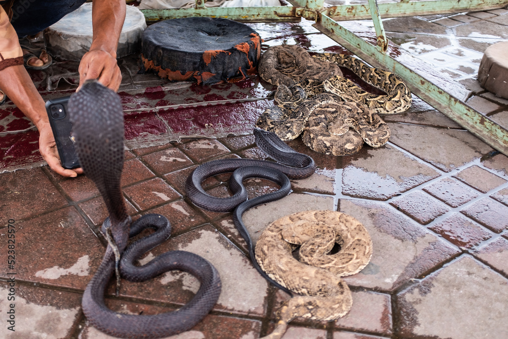 Taking a picture with smart phone of a tamed cobra snake on a touristic place in Marrakesh, Morocco