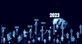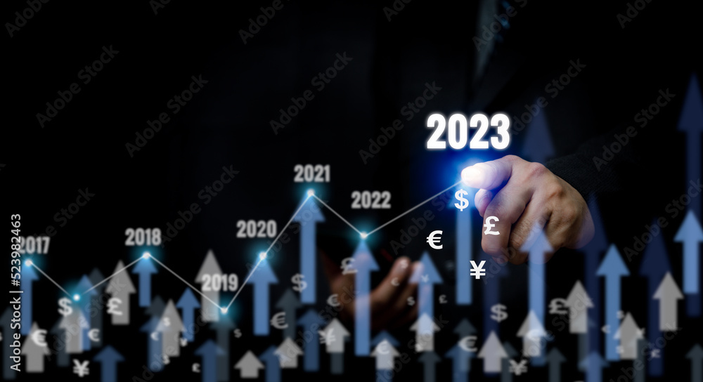 Businessman touch arrow and 2023 currency copy space background.Business finance growth success process investment economic market concept.