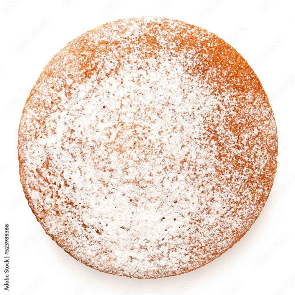 Whole lemon sponge cake with icing sugar topping isolated on white from above.