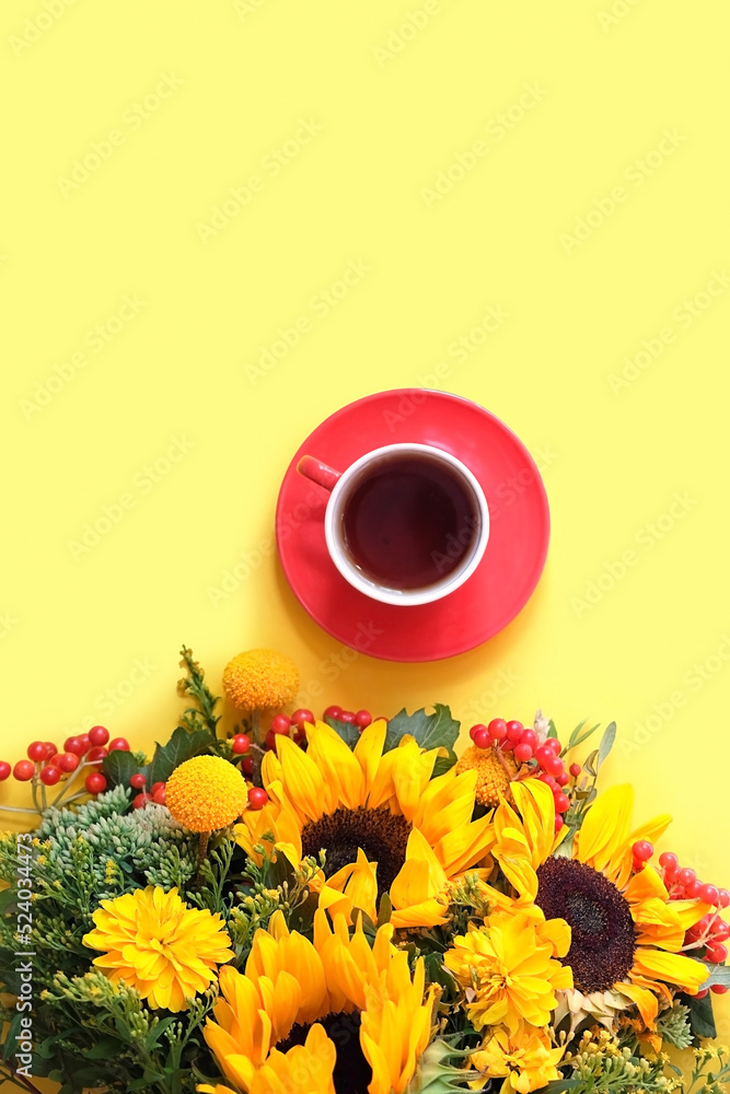 cup of tea and autumn bouquet with sunflowers on abstract yellow background. End of summer, Autumn time concept. tea party. symbol of fall season. minimal style. flat lay. copy space