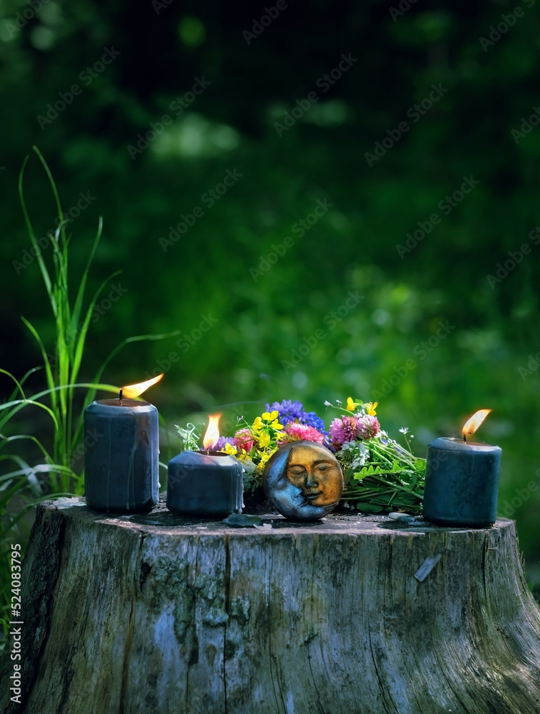 moon amulet, candles and flowers on stump, abstract natural background. Wiccan, Slavic magic practice for Litha, Midsummer. Witchcraft, esoteric spiritual ritual, divination