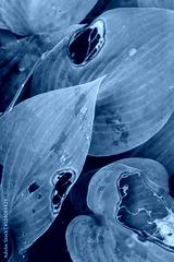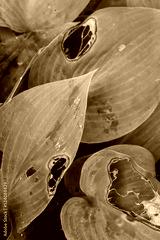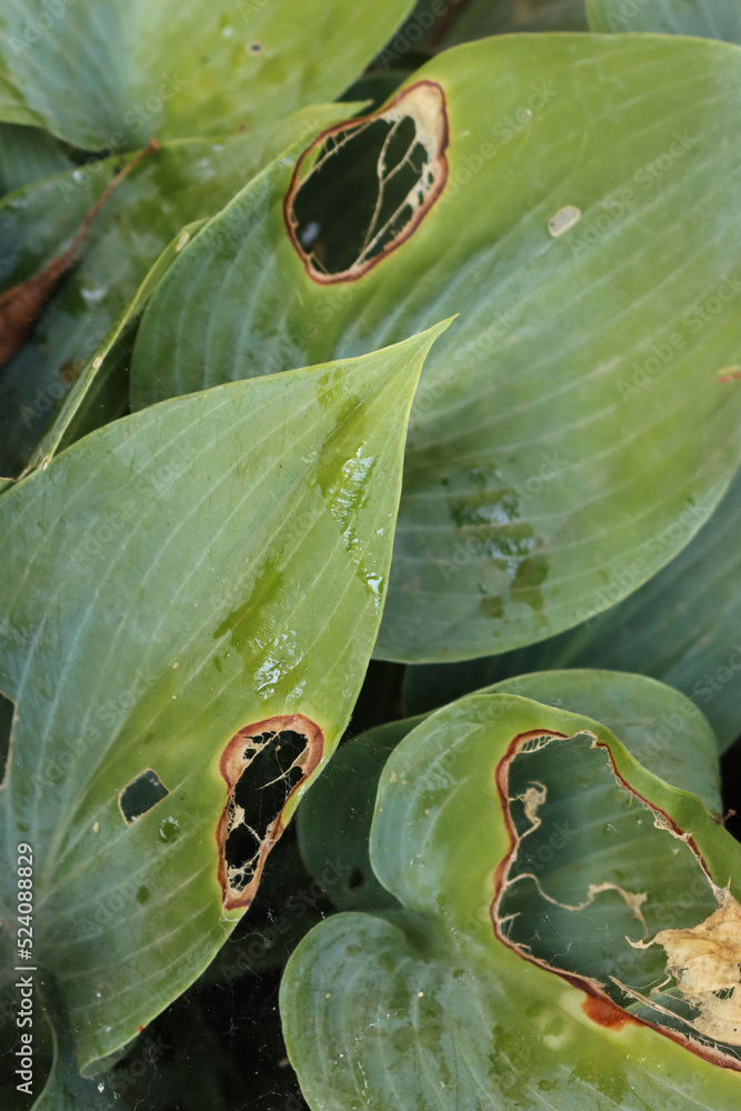 Close-up of Hosta plant damaged by slugs and insects in the flowerbed on summer