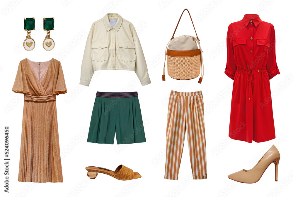 Beautiful women's clothing set. Girl's fashion clothes isolated on white. Collection of lady's apparel. Trendy clothes and accessories