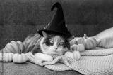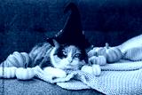 Multicolored cat in witch hat and decorative pumpkins. Relaxed cat in hat lying on the gray plaid with halloween pumpkins decor on the sofa. Autumn, fall holidays. Halloween animals. Selective focus.