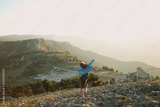 Happy woman runs towards the sun, golden hour in the mountains. people frome behind
