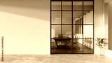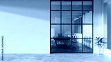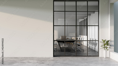 Modern minimal white office corridor or hallway interior with a large window though the meeting room