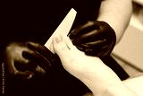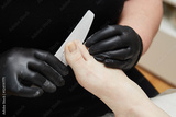 The manicure and pedicure master works with a nail file in a pedicure beauty salon. Black gloves on the hands. Foot care procedure, decorative design on the feet. Hardware pedicure, black background